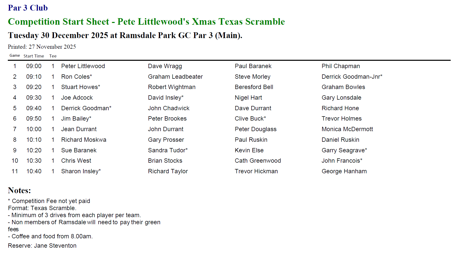 N.B. Prize winnings are paid member Levy Cards for those who are Ramsdale Park members